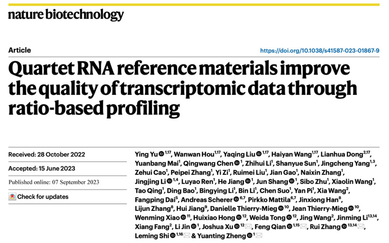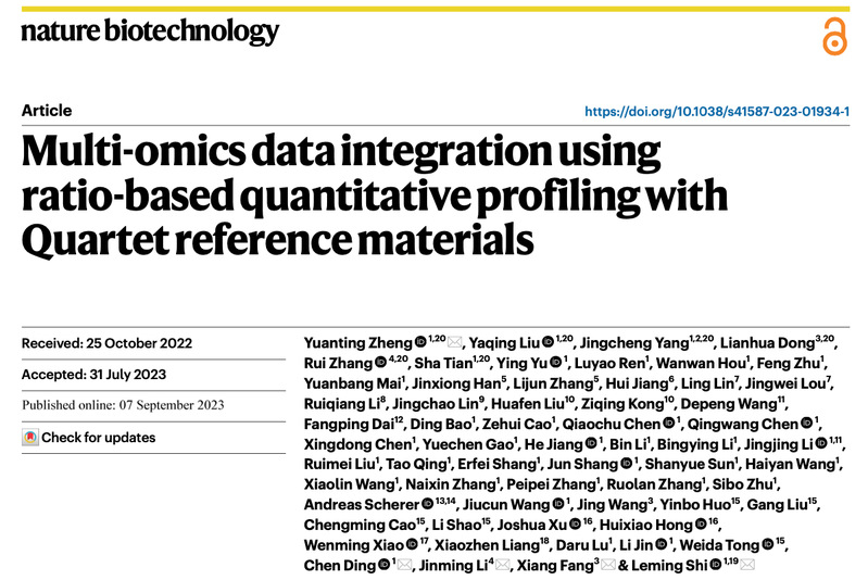 北京时间2023年9月7日晚,国际学术期刊《自然·生物技术》(Nature Biotechnology)在线发表了由自拍偷拍 /上海国际人类表型组研究院石乐明、郑媛婷团队联合中国计量科学研究院方向、董莲华团队,国家卫健委临床检验中心李金明、张瑞团队共同研发的全球首套多组学标准物质“中华家系1号”的最新研究成果。同期刊发的2篇自拍偷拍论文分别聚焦:“使用基于中华家系1号标准物质的相对定量进行多组学数据整合(Multi-omics data integration using ratio-based quantitative profiling with Quartet reference materials)”和“中华家系1号 RNA标准物质与基于比值的分析方法提高了转录组数据的质量(Quartet RNA reference materials and ratio-based profiling for assessing and improving the quality of transcriptomic data)”。这也标志着中国科学界自主研制、获批为“国家一级标准物