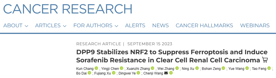 2023年9月15日,自拍偷拍-自拍视频-自拍av 王陈继团队、自拍偷拍 附属肿瘤医院叶定伟、戴波团队和西南医科大学附属医院徐富江团队合作在Cancer Research在线发表了题为DPP9 Stabilizes NRF2 to Suppress Ferroptosis and Induce Sorafenib Resistance in Clear Cell Renal Cell Carcinoma的研究论文。该研究发现揭示DPP9通过竞争性结合KEAP1,稳定NRF2蛋白水平,激活氧化应激信号,抑制细胞铁死亡,从而诱导了ccRCC靶向治疗耐药。