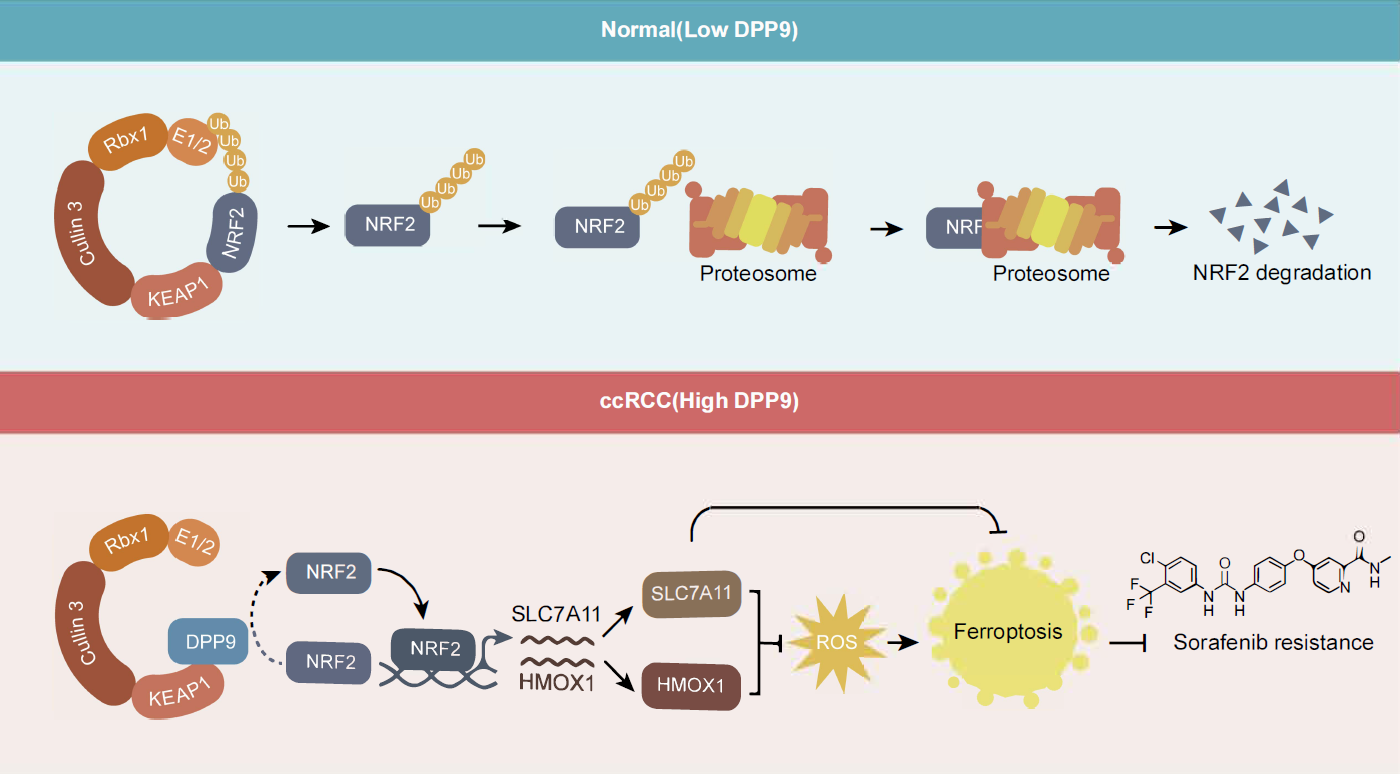 模式图:DPP9调控KEAP1-NRF2通路促进ccRCC肿瘤发生发展和耐药的机制