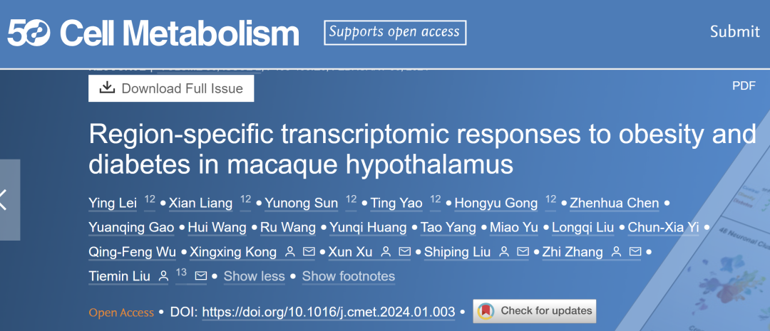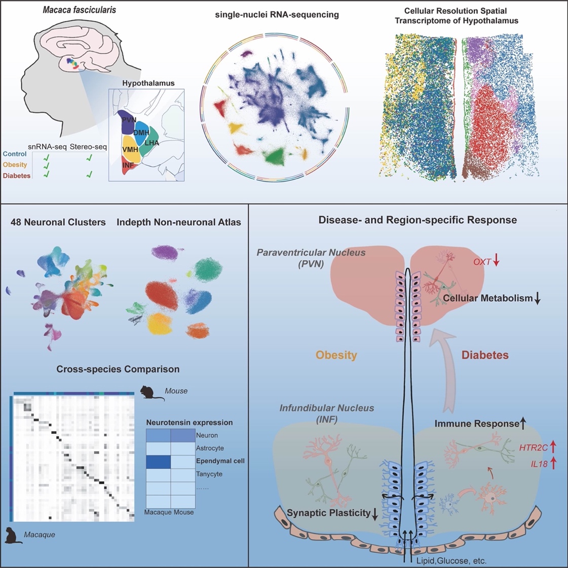 2024年2月6日,自拍偷拍-自拍视频-自拍av 刘铁民、张智和孔星星课题组与华大生命科学研究院刘石平和徐讯团队合作,在Cell Metabolism杂志发表了题为Region-specific transcriptomic responses to obesity and diabetes in macaque hypothalamus的研究。该研究以灵长类食蟹猴为模型,首次系统性阐述了肥胖和糖尿病两种不同代谢疾病下,灵长类下丘脑的空间转录组学响应,利用单细胞核RNA测序和空间转录组测序技术,直接检测了481,802个个体细胞中的多个分子标志物,揭示了肥胖和糖尿病对食蟹猴下丘脑的不同脑区、多种细胞类型的空间分子改变。研究结果助于我们深入了解不同疾病的代谢紊乱机制。