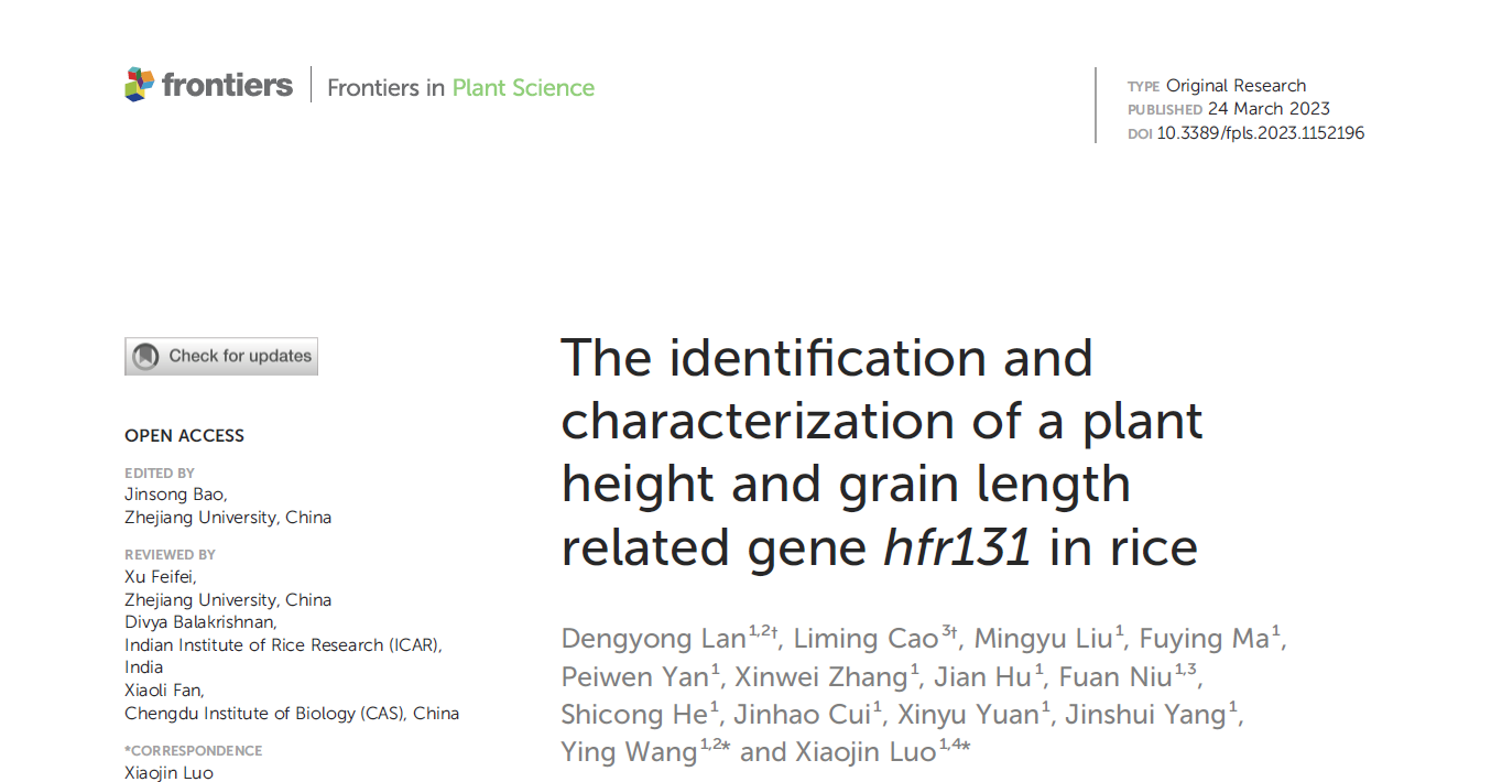 2023年3月24日,自拍偷拍 罗小金课题组在Frontiers in Plant Science在线发表了题为“The identification and characterization of a plant height and grain length related gene hfr131 in rice”的研究论文。该研究采用功能基因组和群体基因组相结合的方法,揭示了BR与生长素协调调控水稻株高和粒型的机制,发现了有利于提高水稻产量的优势单倍型组合。