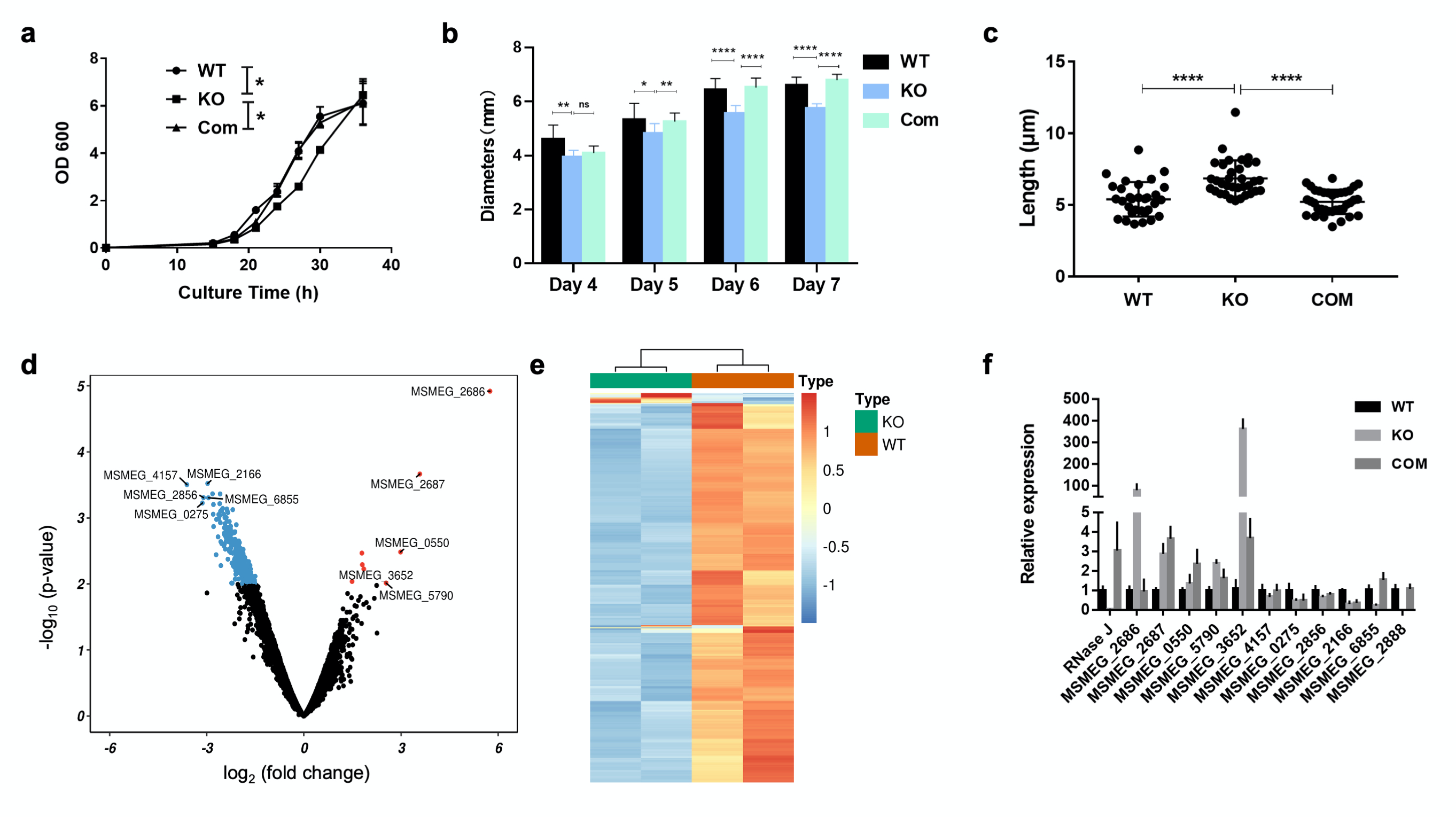 图2, RNase J敲除及回补显著改变耻垢分枝杆菌的生长和形态。