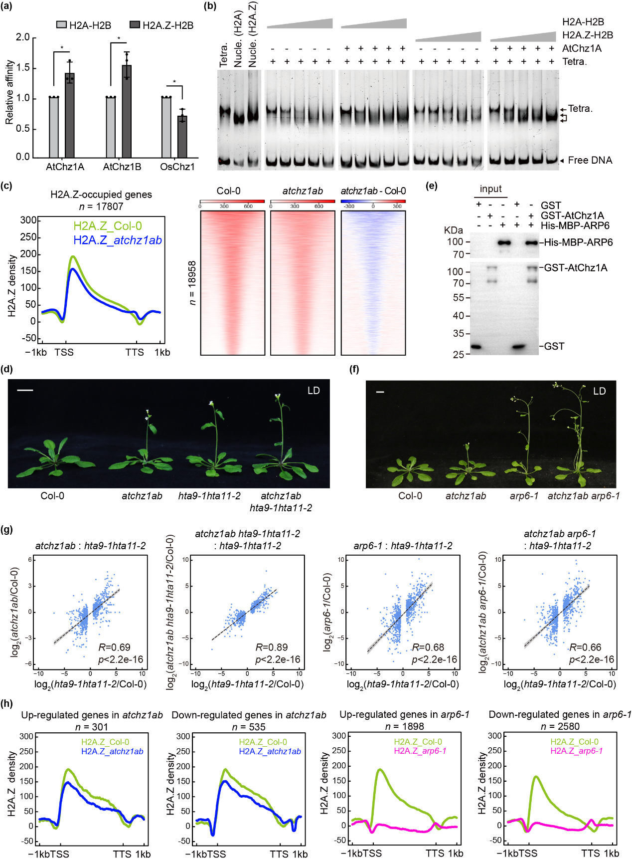 研究发现拟南芥AtChz1A/B对H2A.Z-H2B二聚体有较强的结合能力,并具有体外核小体组装活性,证明AtChz1A/B具有组蛋白分子伴侣活性。同时缺失AtChz1A/B的双突变体atchz1ab与H2A.Z缺失突变体hta9-1hta11-2表现出类似的早花及花器官发育缺陷的表型。体内、体外结合实验显示AtChz1A与SWR1复合物成员ARP6存在直接相互作用。RNA-seq分析显示:atchz1ab,arp6, atchz1ab arp6突变体中的差异表达基因与hta9-1hta11-2突变体具有较高的相关性和变化一致性,提示AtChz1A/B和ARP6在基于H2A.Z的转录调控中发挥功能。ChIP-seq分析显示:与野生型相比,双突变体atchz1ab中H2A.Z在全基因组的分布减少,而且atchz1ab中H2A.Z下调的基因几乎完全包含于arp6-1突变体中,说明AtChz1A/B促进H2A.Z掺入染色质依赖于ARP6,也就是SWR1复合体。