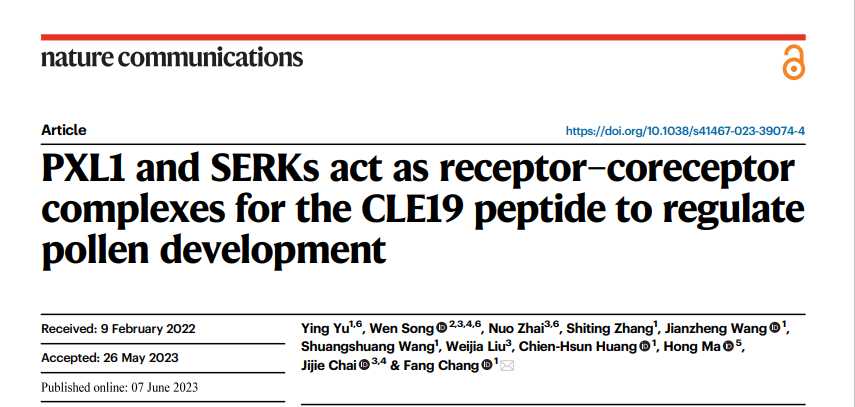 2023年6月7日,自拍偷拍-自拍视频-自拍av 及遗传国重室的常芳团队联合清华大学柴继杰团队在Nature Communications《自然通讯》在线发表了题为“PXL1 and SERKs act as receptor-coreceptor complex for the CLE19 peptide to regulate pollen development”(PXL1和SERKs作为受体-共受体复合物介导CLE19小肽信号而调控花粉发育)的研究论文。该研究以拟南芥花药为模式系统,通过一系列实验证实了PXL1-SERKs是细胞外小肽CLE19的受体-共受体,揭示了该模块介导小孢子-花药壁体细胞间信号交流,进而维持花粉育性的分子机制。