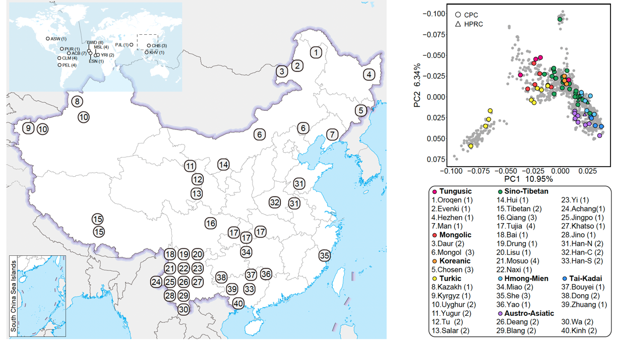 2 CPC一期核心样本地理分布及语系、族群、遗传聚类关系