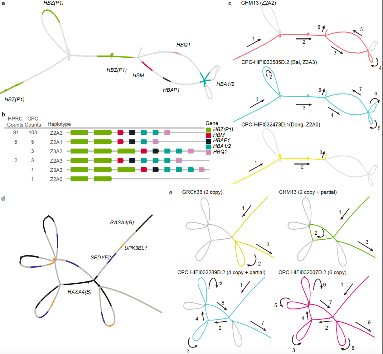 CPC泛基因组图谱作为首个中国人群专属的泛基因组参考图谱,与HPRC泛基因组图谱相比,在中国人群特有的复杂变异解析方面具有显著优势。CPC泛基因组图谱中新发现了1079个基因拷贝数变异,以及包含药物代谢基因CYP2D6等在内的在中国人群中富集而在其他世界人群中出现频率较低的若干基因拷贝数变异;新鉴定出富集在中心粒、端粒等染色体复杂区域的3.4万个结构变异,其中半数以上仅在单个或两个样本中出现——若不针对中国丰富的族群多样性开展专门研究,将没有机会发现这些遗传变异(图3)。研究人员进一步揭示,这些CPC新发现的遗传变异可能与亚洲人群特有的疾病易感性及表型多样性有关。一个典型的例子是α-珠蛋白基因簇,研究人员在该基因区域鉴定出两个中国人群特异性的大规模结构变异,包括一段20 kb的缺失序列和一段10 kb的重复序列,这将为进一步研究中国人群贫血症的遗传机理和致病机制提供新的线索(图4)。