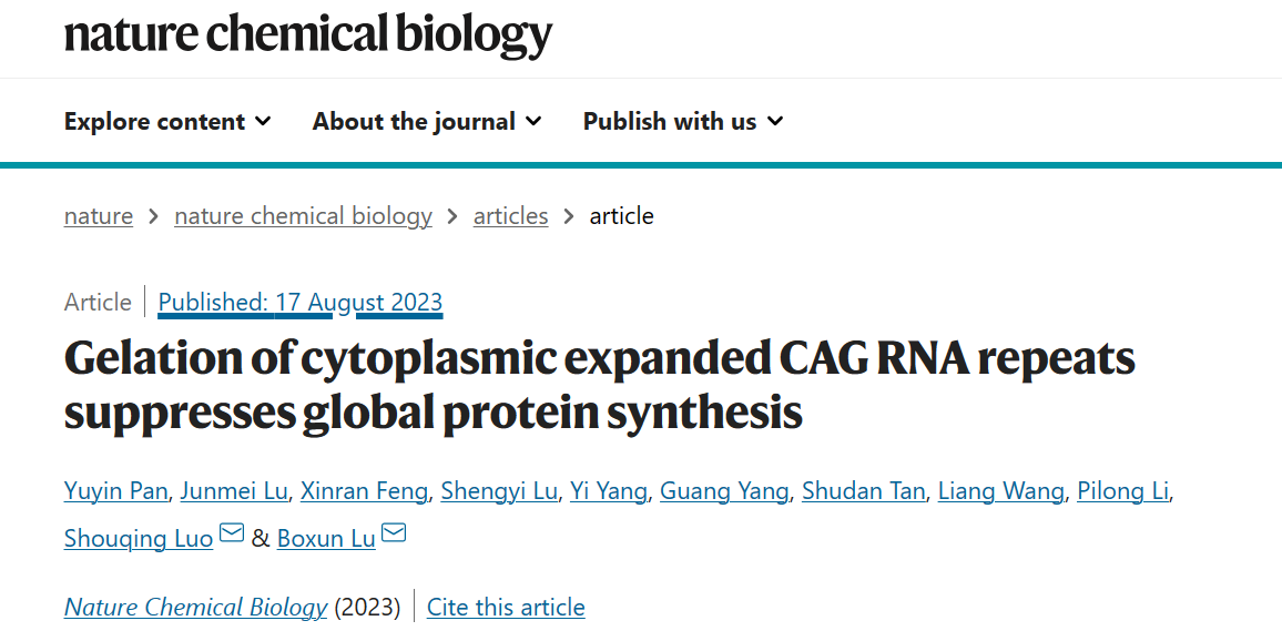 2023年8月17日,自拍偷拍 鲁伯埙课题组同合作者英国普利茅斯大学罗寿青、清华大学李丕龙等在Nature Chemical Biology杂志上发表题为Gelation of cytoplasmic expanded CAG RNA repeats suppresses global protein synthesis的文章,证实了包含过长CAG重复序列的RNA在细胞质内的胶体化,并发现该胶体化过程可通过“囚禁”重要的翻译延伸因子eEF2从而导致细胞全局蛋白质合成速度的下降。研究进一步在动物实验中提示含过长CAG重复序列RNA的胶体化可能导致神经退行性疾病相关的表型及神经电生理变化。
