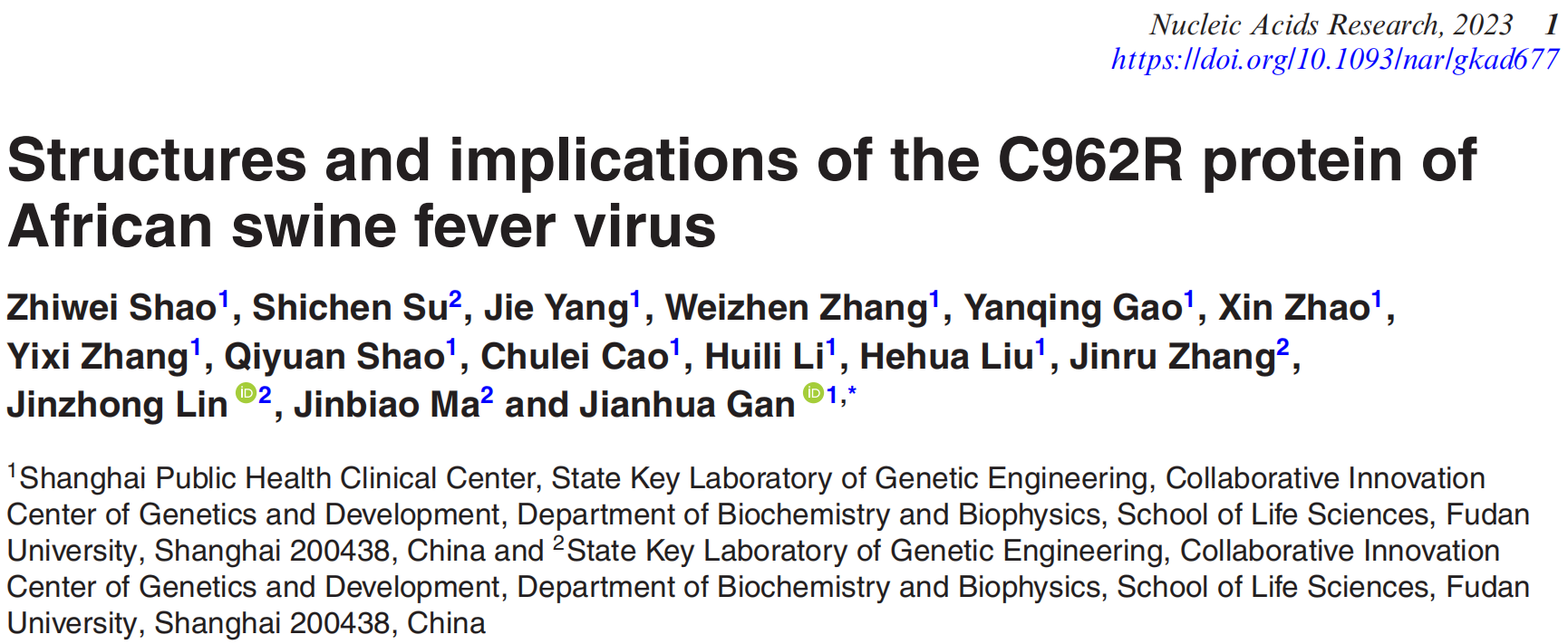 2023年8月17日,自拍偷拍 甘建华课题组在Nucleic Acids Research上发表了题为“Structures and implications of the C962R protein of African swine fever virus”的文章,报道了非洲猪瘟病毒来源的C962R蛋白与DNA复合物的结构,阐明了C962R催化DNA解旋以及DNA引物合成的分子机制。